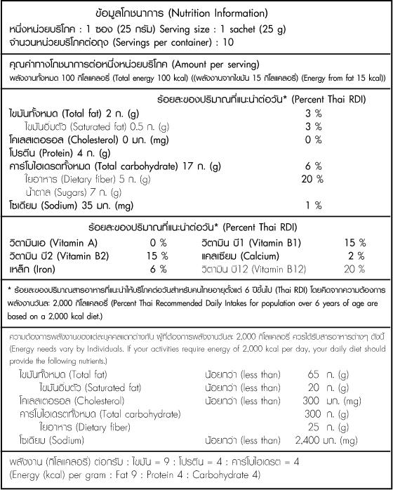 เครื่องดื่มธัญพืชพร้อมชงสำเร็จรูป สูตรข้าวกล้องไรซ์เบอร์รี่ผสม เห็ด 5 ชนิด และนมถั่วเหลืองออร์แกนิก 1 ซองให้พลังงานทั้งหมด 100 กิโลแคลอรี่ ไขม้นต่ำ เป็นอีกทางเลือกของผู้รักสุขภาพ วิธีการชง : 1 ซอง 25 กรัม เติมน้ำร้อนประมาณ 200 มล. คนให้เข้ากัน