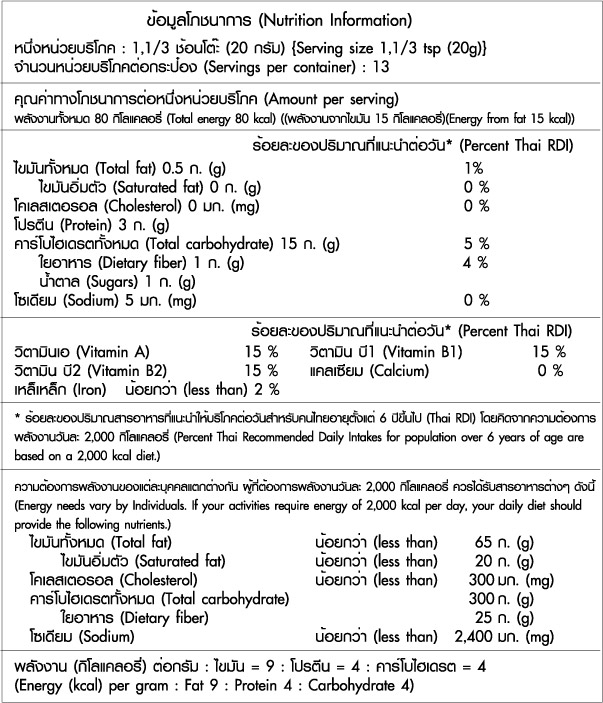 เป็นเครื่องดื่มธัญญาหารสำเร็จรูปพร้อมชง ประกอบด้วยผงแปะก๊วย ผงข้าวกล้อง และผงข้าวโอ๊ต รสชาติอร่อย ดื่มง่าย ได้ประโยชน์จากธัญพืช ธรรมชาติ 100% สามารถตักชงได้ตามชอบ ดื่มได้ทุกเมื่อที่ต้องการ เจทานได้ค่ะ
